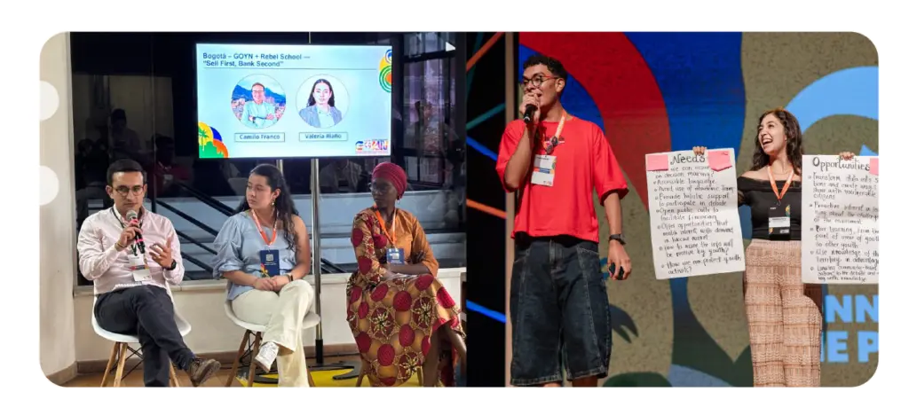 Durante la Convención Global GOYN 2025, el equipo de GOYN Bogotá y los integrantes del Grupo Asesor de Jóvenes elegidos: Valeria Riaño y Andrés Rodríguez. Participaron activamente en espacios dedicados al fortalecimiento de las economías verdes, la inclusión financiera juvenil y la participación de las y los jóvenes en la sostenibilidad ambiental.